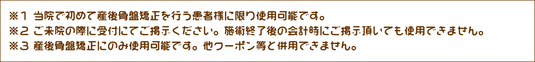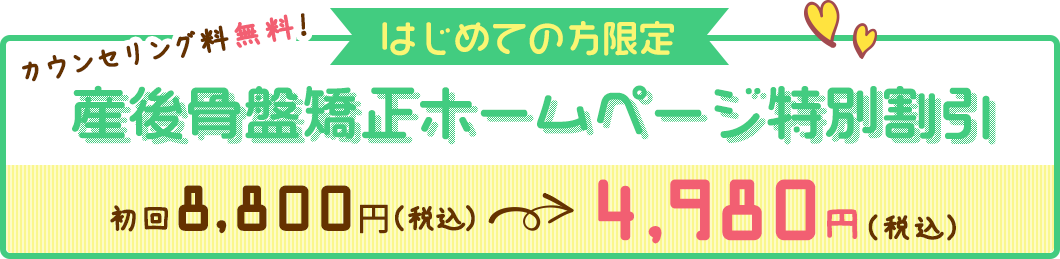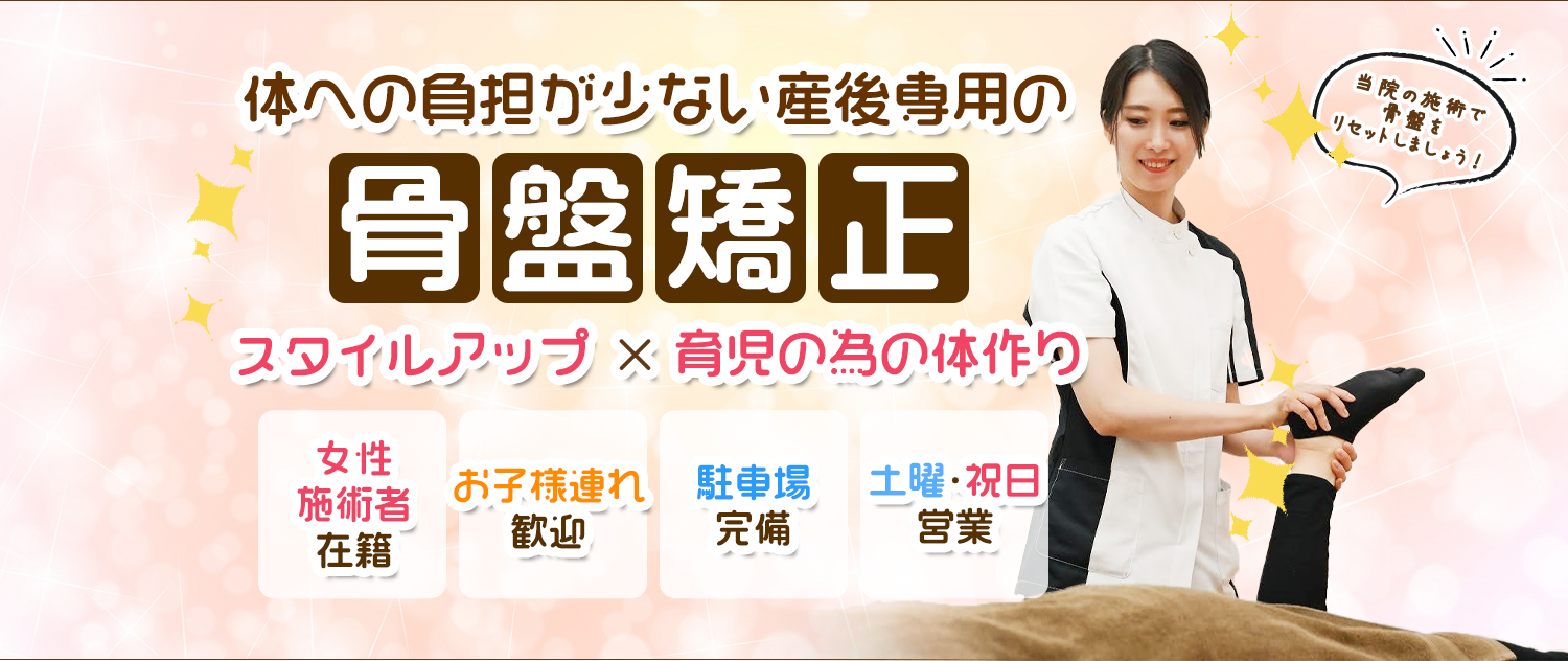 当院では産後2ヶ月目から6ヶ月までの方に産後骨盤矯正を行っています。始める時期としては産後産後2ヶ月から3ヶ月目の早い時期のスタートをおすすめしています。普通分娩、帝王切開、出産時の出血量など、それぞれの方の状態や症状よって異なりますので、まずは当院へ一度ご相談されることをおすすめします。