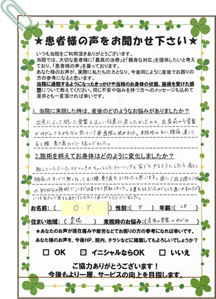 教えていただいたストレッチやちょっとしたトレーニングを家でもやるようにしたら肩こり、腰痛はすっかりなくなって反り腰、巻き肩も良くなったと思います。