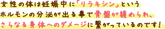 妊娠中の女性の体は、リラキシンというホルモンの分泌により骨盤が緩められ、お腹の中を赤ちゃんが育ちやすい状態に整え、出産時には産道のスペースを確保することにも繋がります。