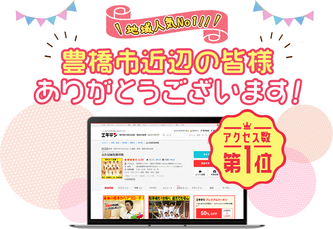 豊橋市南栄町で開業以来おかげ様で十数年が経ち、年間延べ2万人を超える患者様を施術してまいりました。
